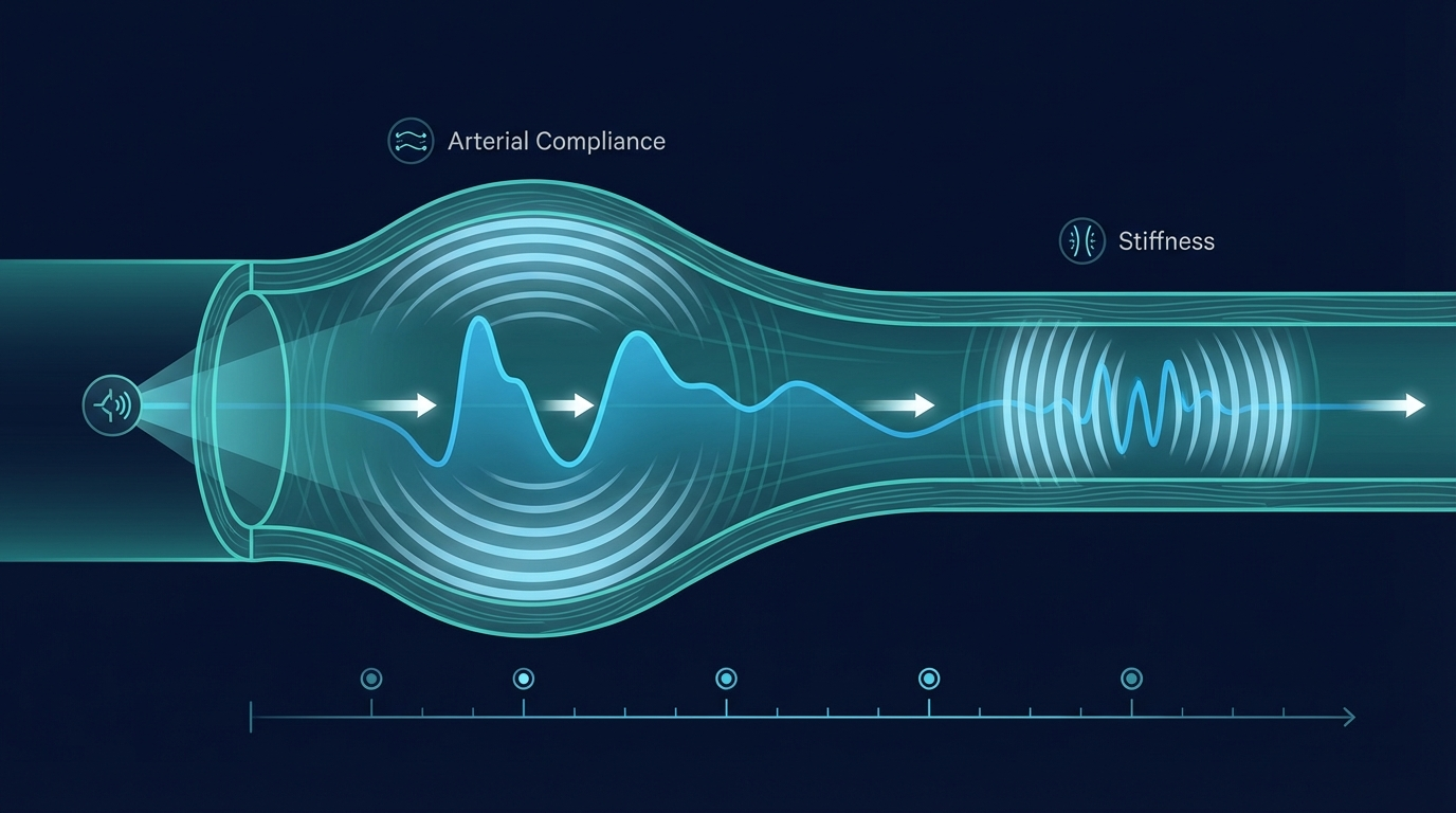 Pulse wave velocity (PWV) is the speed at which a pressure wave travels through your arteries after each heartbeat. A higher PWV means stiffer arteries — and stiffer arteries mean higher cardiovascular risk. PPG sensors in modern wearables can estimate PWV non-invasively, making this once-clinical measurement available to anyone with a smartwatch.